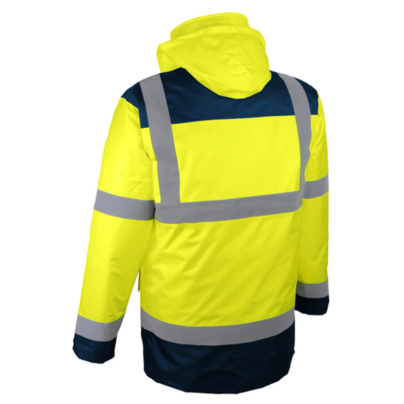 Parka haute visibilité 4×1. Matière extérieur : 100% polyester (Oxford 300D) enduit PU. Doublure : polyester taffetas. Coutures étanchées.