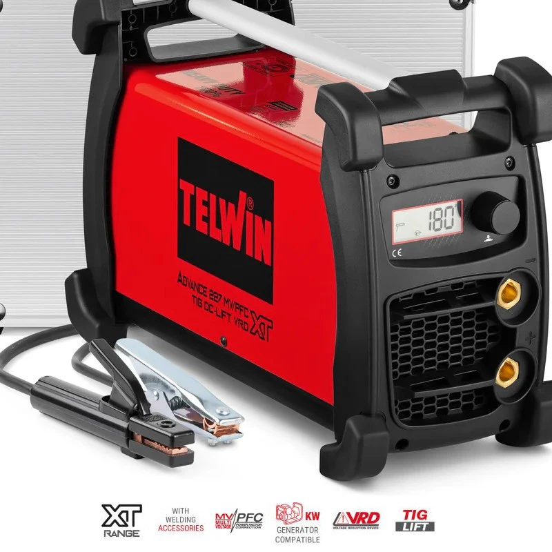 Protection thermostatique, surtension, sous-tension, surintensité. Compatible avec motogénérateur (230 V, +/-15 %). Haute stabilité du courant de soudage aux variations de la tension d’alimentation.
